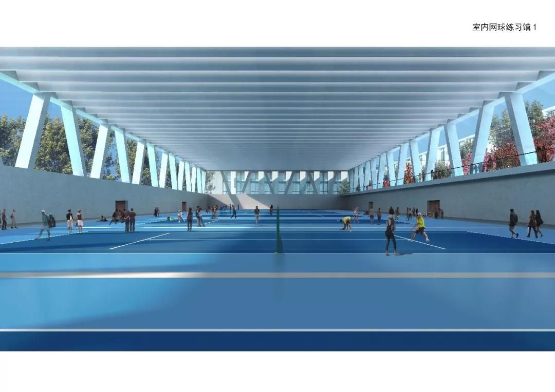 主要建設中心賽場,室內網球練習館(含常規場地、網球中心配套用房、VIP室內場地及其配套服務用房、學員公寓)單跨跨度約42米,室內網球練習館(紅土場地),籃球館,教員公寓,室外網球比賽場,室外網球練習場及地下停車場。